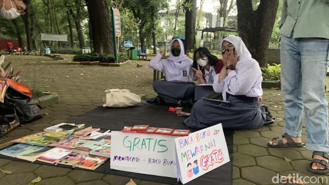 Jika detikers mampir ke Taman Lansia di sore hari, ada sesuatu yang menarik perhatian. Di tengah rimbunnya pepohonan, seorang pemuda berkacamata menggelar tikar beserta buku-buku dan pensil warna. Dengan secarik kertas putih dan spidol warna, ia memajang tulisan "Gratis Mewarnai dan Baca Buku".
