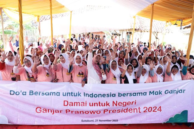 Emak-emak di Sukabumi yang tergabung dalam gerakan relawan Mak Ganjar Jawa Barat (Jabar) menggelar doa bersama untuk Indonesia. Kegiatan yang berlangsung di Desa Cimanggu, Kecamatan Cikembar, Sukabumi ini diikuti lebih dari 500 emak-emak dari berbagai daerah di Sukabumi.