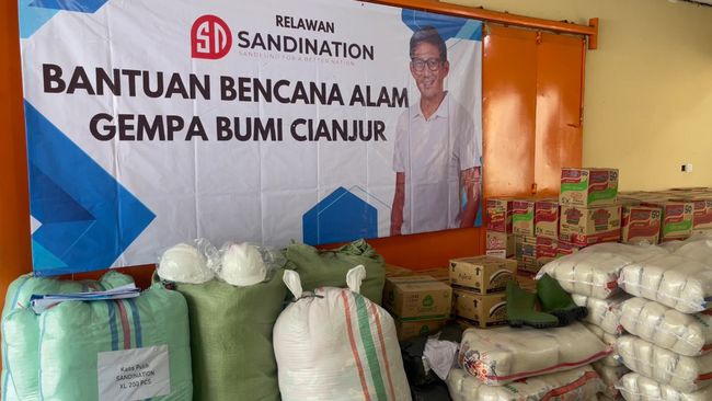 Relawan pendukung Sandiaga Uno, Sandination menyalurkan bantuan untuk korban bencana gempa di Cianjur, Jawa Barat. Adapun bantuan diberikan kepada 20 titik lokasi terdampak.