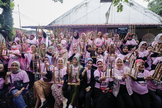 Relawan Srikandi Ganjar menggelar kegiatan belajar alat musik angklung dengan para perempuan di Kota Bandung, Jawa Barat hari ini. Dalam kegiatan ini, setiap peserta difasilitasi satu buah angklung untuk belajar, serta dipandu instruktur angklung profesional.