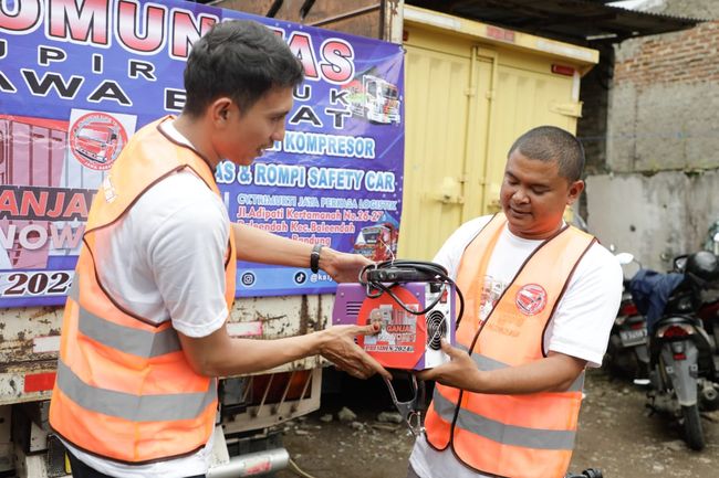 Komunitas Sopir Truk (KST) Jawa Barat pendukung Ganjar Pranowo memberikan mesin las, kompresor dan rompi safety car ke para sopir truk yang tergabung dalam perkumpulan Kaharingan Group dari Trimurti Jaya di Baleendah, Kabupaten Bandung.