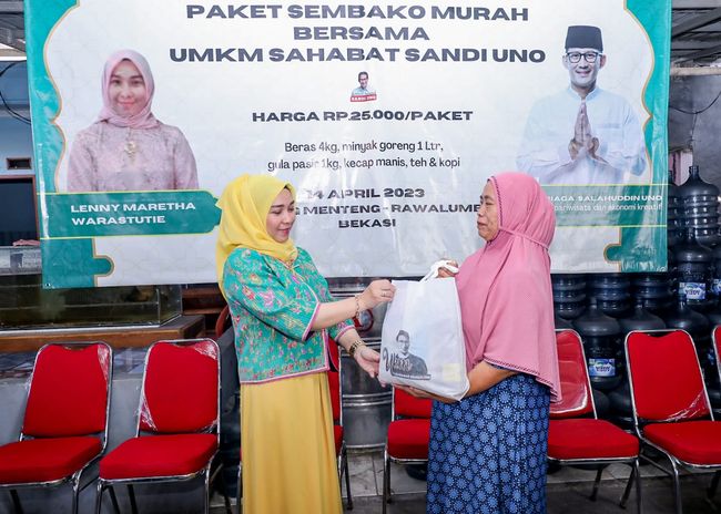 Tim UMKM Sahabat Sandi Bekasi Lenny Maretha menyebutkan kegiatan sembako murah ini untuk membantu warga menghadapi kenaikan harga yang biasa terjadi jelang Hari Raya Idul Fitri.