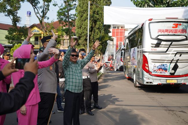 Bupati Garut, Rudy Gunawan melepas 6 armada bus dalam program Mudik Gratis Presisi Polres Garut Tahun 2023. Pelepasan yang berlangsung di Polres Garut ini turut diikuti bersama Kepala Kepolisian Resor (Kapolres) Garut, AKBP Rio Wahyu Anggoro.
