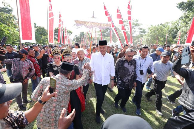 Ganjar yang datang mengenakan kemeja putih dengan kopiah hitam langsung disambut tari lengser dari upacara adat Sunda lengseran di pintu masuk Taman Prabuwangi, Kecamatan Arcamanik, Bandung. Iring-iringan bendera merah putih dengan alunan lagu Sunda dan payung khas kerajaan yang disuguhkan kepada Ganjar mewarnai sambutan adat Jabar tersebut.