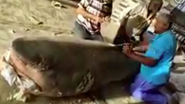 Warga yang sudah menunggu di daratan segera menghakimi hiu tersebut. Pukulan demi pukulan diberikan pada tubuh hiu tersebut.