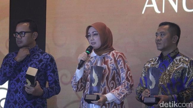 Ajang detikJabar Awards digelar di The Trans Luxury Hotel Bandung, Selasa (20/6/2023). Pemberian piala diserahkan oleh Direktur Transmedia Latief Harnoko yang diterima oleh Bupati Purwakarta Anne Ratna Mustika.
