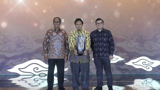 Ajang detikJabar Awards digelar di The Trans Luxury Hotel Bandung, Selasa (20/6/2023). Pemberian piala diserahkan Direktur Utama detikcom Abdul Aziz yang diterima Layala Roesli,.