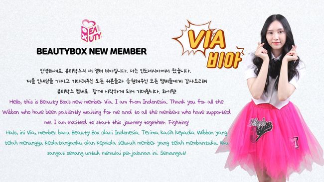Poster tersebut memuat foto Via, ia mengucapkan terima kasih kepada member dan penggemar Beauty Box (Wibbon) yang menyambutnya sebagai member baru.