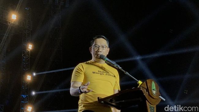 Gubernur Jabar Ridwan Kamil tiba di lokasi konser West Java Festival di Stadion Siliwangi, Jalan Lombok, Kota Bandung, Minggu (3/8/2023) sekitar pukul 18.15 WIB. Kang Emil, begitu ia akrab disapa terlihat kasual menggunakan kaos kuning bertuliskan 'Nuhun Warga Jabar'.