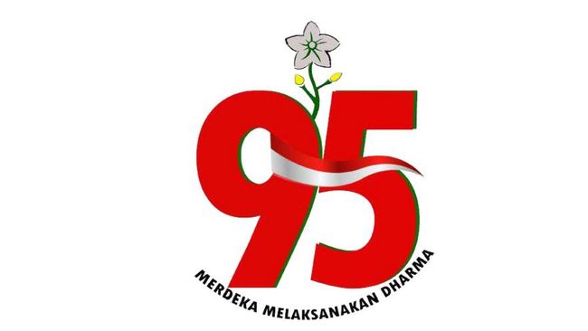Logo Hari Ibu ke-95 berbentuk angka 95 berwarna merah dengan tulisan 'MERDEKA MELAKSANAKAN DHARMA' pada bagian bawah. Di antara angka 9 dan 5, terdapat elemen bendera merah putih berkibar. Sementara pada bagian atas kanan angka 9 terdapat setangkai bunga melati.