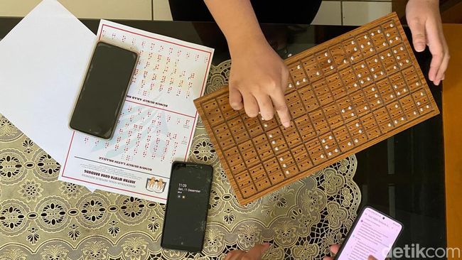 "Ini kalau misalnya baru belajar braille, pakainya ini, namanya papan pantule. Alatnya ini nggak dijual sembarangan. Nah ini buat yang baru bisa belajar braille. Ini huruf A, ini huruf B, ini huruf C gitu," sebutnya sambil mempraktikkan alat tersebut kepada detikJabar.