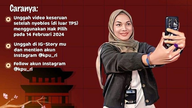 Membuat momen Pemilu 2024 ini semakin semarak, KPU RI membuat kegiatan seru nih yakni mengajak pemilih untuk mengunggah keseruan usai mencoblos! KPU RI pun menyiapkan hadiah bagi unggahan story menarik.