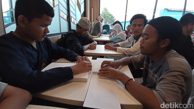 Puluhan disabilitas netra Kota Tasikmalaya menggelar kegiatan tadarusan bersama di sebuah restoran cepat saji di Jalan Ir. Djuanda Kota Tasikmalaya, Minggu (17/3/2024) sore. Tak ayal suasana restoran itu menjadi lain dari biasanya menyusul lantunan ayat suci Al-Qur'an yang dibacakan penyandang tuna netra secara bersamaan.