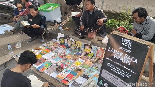 Kini, lihatlah, sudah dua kali minggu ada sekelompok pemuda yang menggelar lapak baca gratis di kawasan yang tak pernah istirahat itu. Buku-buku digelar pada selembar kain bekas spanduk. Orang-orang melintas singgah, memilih buku, lalu mojok dengan bacaan yang mereka pilih.