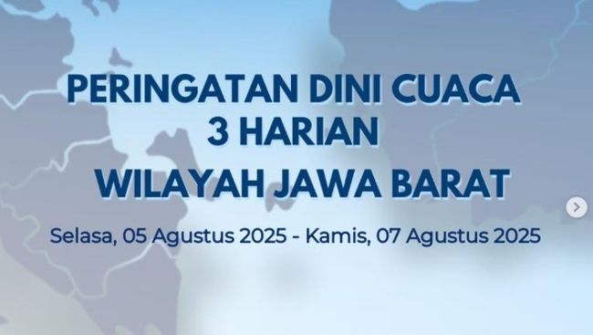 Warga Jawa Barat diimbau untuk lebih waspada terhadap potensi cuaca ekstrem dalam tiga hari ke depan, mulai 5 hingga 7 Agustus 2025. Berdasarkan data resmi dari Stasiun Klimatologi BMKG Jawa Barat, sejumlah wilayah di provinsi ini masuk dalam kategori peringatan dini cuaca dengan status Waspada.