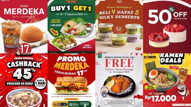 Perayaan Hari Ulang Tahun (HUT) ke-80 Kemerdekaan Republik Indonesia yang jatuh pada Minggu, 17 Agustus 2025, tak hanya dimeriahkan dengan lomba atau upacara. Momen istimewa ini juga menjadi ajang bagi berbagai brand kuliner ternama untuk turut menyemarakkan euforia kemerdekaan dengan menawarkan beragam diskon dan promo menarik. Bahkan, tak sedikit promo yang menghadirkan potongan harga fantastis hingga 50 persen, atau penawaran beli satu gratis satu yang sayang untuk dilewatkan.