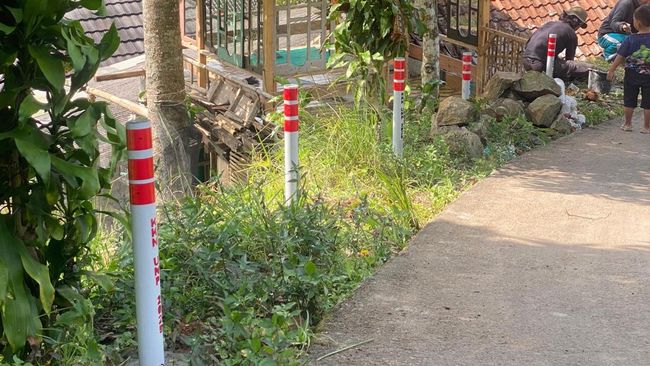 Jalan-jalan desa yang membelah tebing dan jurang kini lebih aman dilalui, setidaknya sejak mahasiswa Kuliah Kerja Nyata (KKN) Nusa Putra University memasangnya pada akhir Agustus lalu.