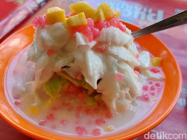 Satu mangkuk es campur dipesan ini berisi toping pacar cina, kelapa muda, potongan nangka, kolang kaling dan alpukat.