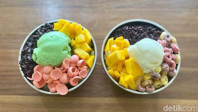 Toppingnya beragam, mulai dari es krim hingga sereal. Ini berbeda dari bubur ketan pada umumnya yang biasanya hanya disajikan dengan pelengkap saus santan kental.
