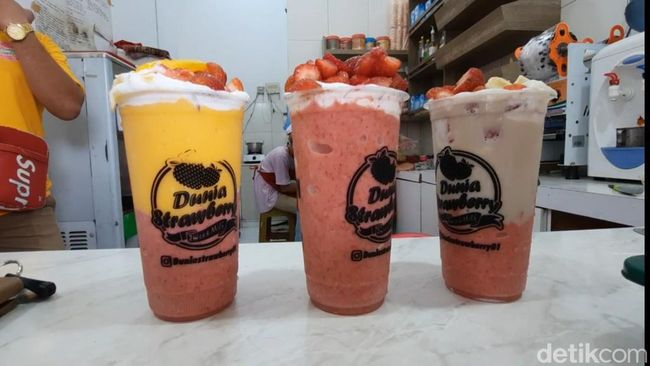 "Kita cari yang berbeda dari yang lain. Selain jusnya beda sama yang lain, kita tambahan topping buah. Ada varian strawbary king, dragon banana dan manggo king yang favorit," kata Muhammad Syahrul Gunawan, pemilik Jus Dunia Stroberi.