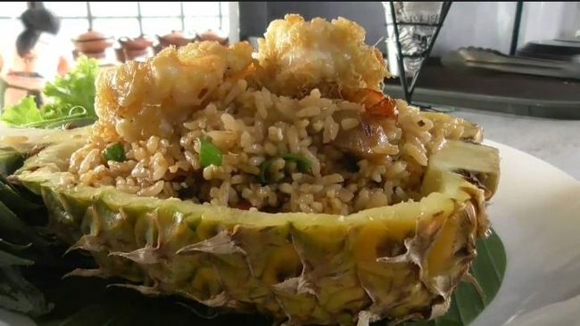 Nasi goreng nanas ini tentunya tak biasa. Selain rasa, wadah penyajiannya tak menggunakan piring, melainkan buah nanas yang dagingnya telah dikeruk hingga menyerupai mangkuk. Karena rasanya yang unik, nasi goreng nanas menjadi salah satu menu favorit para pelancong.