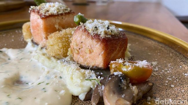DetikJabar sempat mencicipi makanan ini. Ikan salmon diolah dengan cara grilled, kemudian ditambah herb crumb, potato croquette, topping sauteed mushroom garlic, dan disiram cilantro sauce.