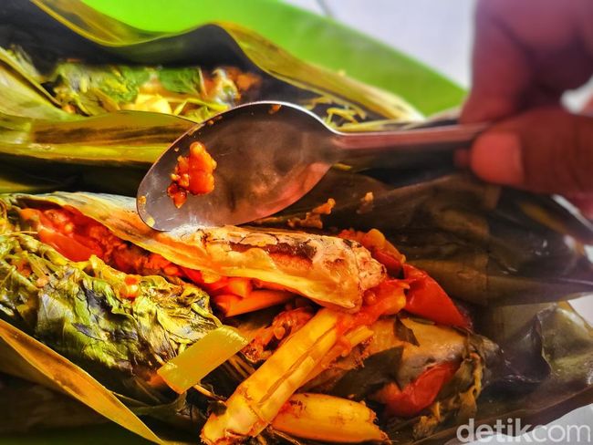 "Salam, serai, kemangi, bawang putih, bawang merah, cabe merah, muncang, merica, penyedap rasa, daun bawang, lalu bawang putih, bawang merah, kunyit, muncang dan merica ditumbuk hingga halus," kata Nanan.