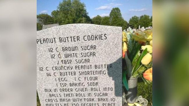 Batu nisan di kuburan itu bahkan disandingkan bunga khusus. Resep cookie selai kacangnya tertulis detail di batu nisannya, mulai dari porsi bahan yang digunakan hingga cara membuatnya.