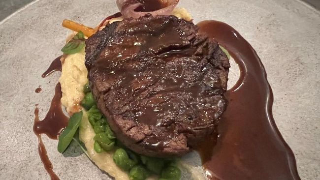 Sementara US Wagyu tenderloin yang disajikan dengan kacang polong tak kalah memikat. Dipanggang dengan kematangan pas, wagyu empuk juicy ini dipadukan dengan Stillo Primitivo di Manduria.