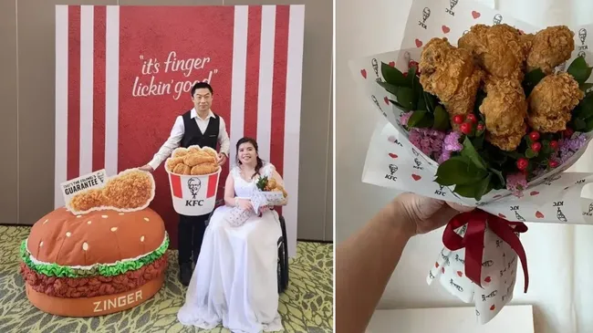 Pasangan pengantin ini ternyata memang menggemari KFC. Tak hanya hidangan prasmanan di pestanya, tapi buket bunganya juga dihiasi dengan paha ayam goreng dari KFC.