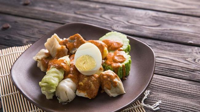 Separuh adonan yang sama juga diisikan pada kentang, tahu putih, dan pare. Semuanya dikukus dan disajikan dengan sambal kacang plus jeruk limau sebagai pelengkap.