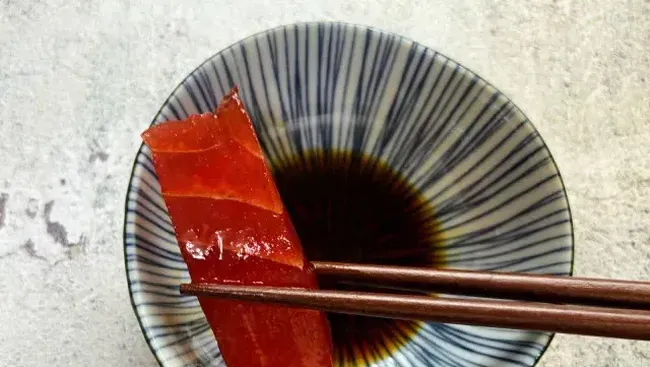 Hasilnya benar-benar terlihat seperti sepotong daging tuna mentah. Padahal tuna imitasi ini terbuat dari 3 bahan utama, yaitu tepung konjac, garam, dan trehalosa (bahan untuk menambah rasa manis dan meningkatkan rasa).