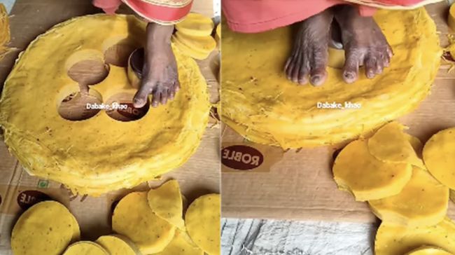 Video ini juga memperlihatkan bagaimana lembaran papad ditumpuk untuk dibentuk bulat-bulat. Caranya memakai cetakan baja bentuk bulat yang ditekan menggunakan kaki telanjang!