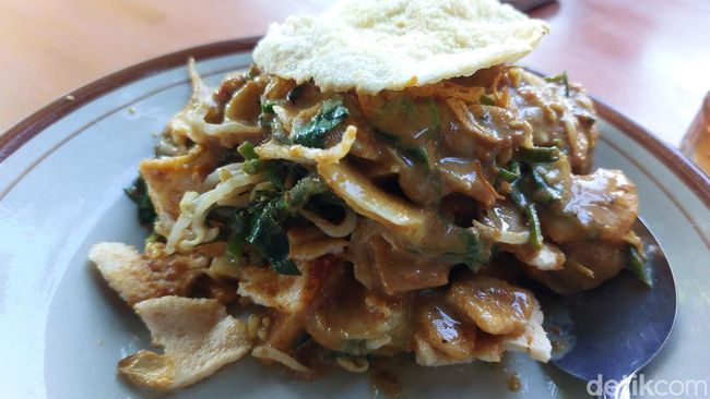 "Kalau gado-gado biasa kan buat encerin gilingan kacang pake air biasa. Tapi kalau kami beda, kami ini pake kuah kari ayam, selain itu ada tambahan emping dan kerupuk udang dalam satu porsi hidangan gado-gado," paparnya.