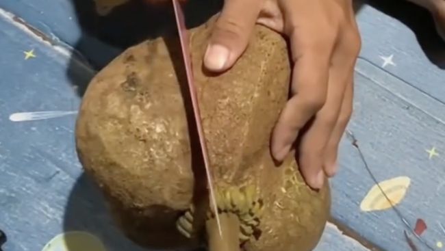Tampak dalam video, petani membelah durian dengan mudah karena tak ada duri. Kulitnya tebal berwarna kecokelatan. Begitu dibuka, masih ada lapisan kulit tebal berwarna putih. Setelah dibuka lebih lanjut, barulah terlihat bongkahan buah durian!