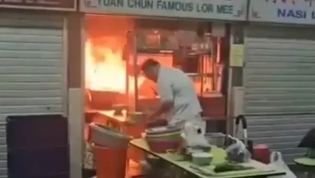 Aksi penjual makanan memindahkan makanan dan peralatan saat kebakaran melanda kedainya mencuri perhatian warga Singapura. Pasalnya, sang penjual tampak santai walau terlihat kobaran api di dapurnya.