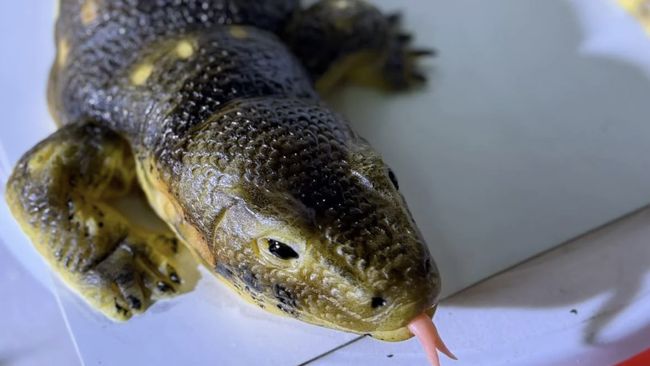 Tampilan biawak air juga dihadirkan lewat warna kuning kehitaman, serta ciri khas buntut belang. Tak ketinggalan, lidah terbelah yang menjulur dari reptil ini.