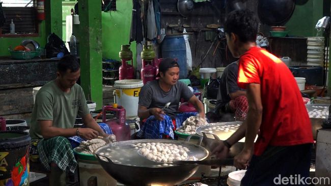 Pantauan di lokasi, suasana di salah satu dapur produksi bakso tampak sibuk sejak pagi. Di balik tembok bercat hijau tua, ruangan beratap seng itu dipenuhi asap kayu bakar yang menggantung di udara. Sejumlah pekerja duduk berjajar di lantai, mengenakan sarung dan kaus oblong. Tangan mereka cekatan membentuk bulatan demi bulatan bakso disebut nyelocot dalam istilah mereka.