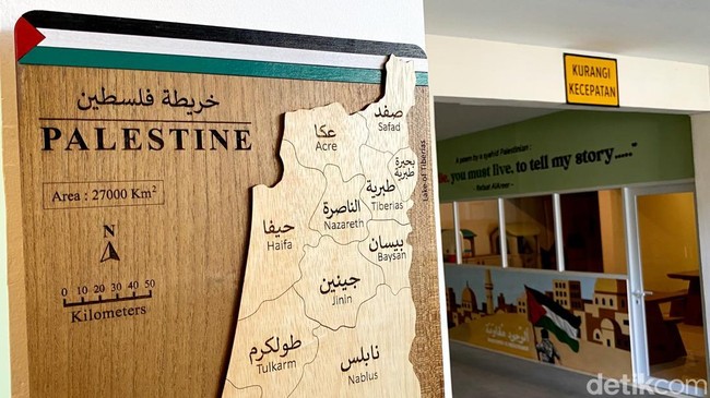 Menariknya kafe satu ini, memiliki banyak properti bertemakan Palestina, dari mulai peta, bendera, buku-buku tokoh dan perjuangan rakyat Palestina dalam merebut kemerdekaan, hingga mural yang menggambarkan perlawanan rakyat Palestina terhadap Zionis Israel demi melindungi Masjid Al-Aqsa.