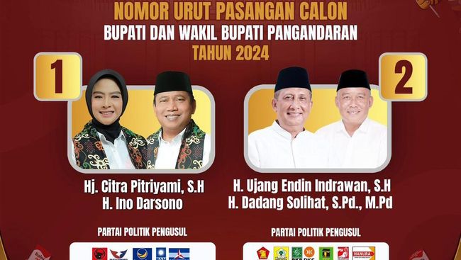 Sebagaimana diketahui, Pilbup Pangandaran 2024 hanya diikuti dua pasangan calon. Nomor urut 1 Citra Pitriyami-Ino Darsono, dan nomor 2 Ujang Endin Indrawan-Dadang Solihat.