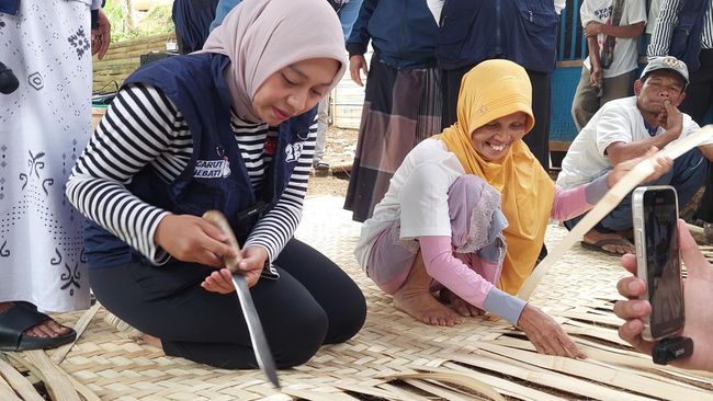 Di lokasi, Putri bertemu dengan sejumlah perajin dan sempat ikut menganyam bilik yang terbuat dari bambu itu.