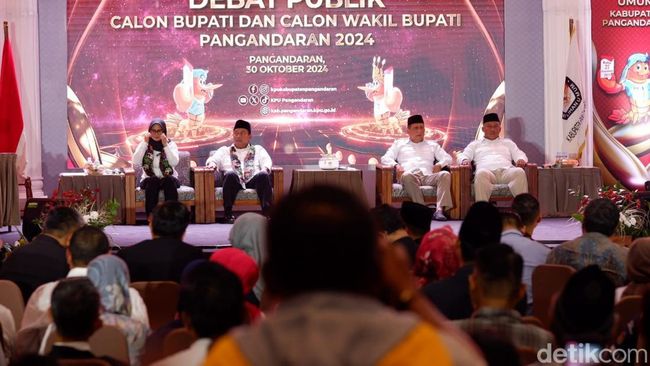 Debat publik edisi pertama ini digelar di Hotel Pantai Indah Pangandaran pada Rabu (30/10/2024) siang. Ada dua paslon yang berdebat yakni paslon nomor urut 1 Citra Pitriyami-Ino Darsono dan nomor urut 2 Ujang Endin-Dadang Solihat.