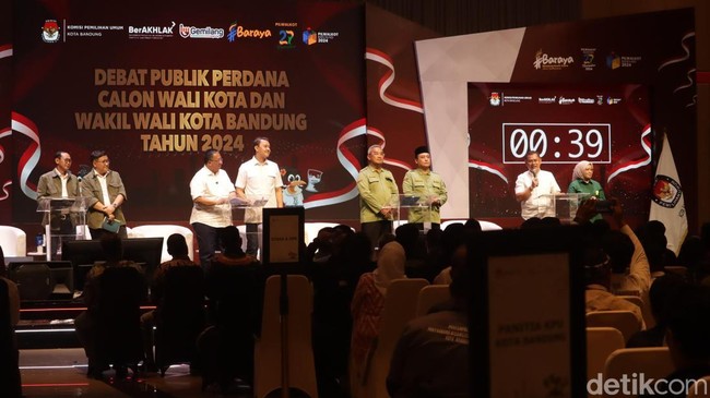 Dimulai pukul 20.30 WIB, debat publik Pilkada Kota Bandung 2024 dilaksanakan selama 120 menit. Tema debat perdana Pilwalkot Bandung 2024 yakni 'Tantangan Masa Depan Kota Bandung Mengintegrasikan Inovasi Tata Kelola Pemerintahan, Keberlanjutan Lingkungan, dan Tata Ruang yang Efisien'.