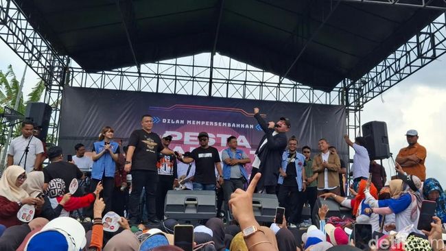 Pendukung dan simpatisan pasangan berjuluk 'Dilan' itu hanyut dalam alunan musik mengiringi King Nassar saat menyanyikan sejumlah lagu dangdut hits, seperti Gala-gala, Jayanti, hingga Mati Lampu yang jadi andalannya.