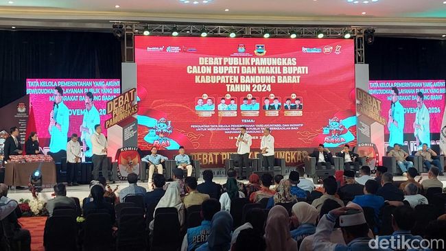 Lima pasangan calon bupati dan wakil bupati menjalani debat pamungkas Pilbup Bandung Barat 2024. Debat digelar di salah satu hotel di Lembang, Bandung Barat, Senin (18/11/2024) malam.