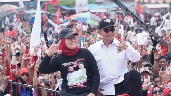 Di atas panggung, Nina-Tobroni terlihat menyerukan semangat dan permohonan dukungan kepada masyarakat. Tak ketinggalan, Nina juga menyampaikan sejumlah janjinya kelak jika terpilih.