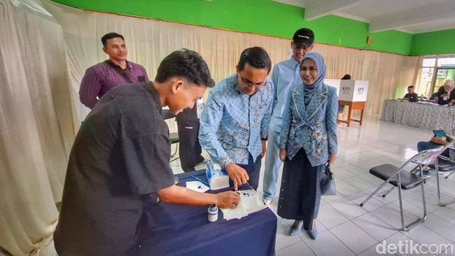 Pantauan detikJabar di lokasi, Sahrul Gunawan datang kompak bersama istrinya mengenakan pakaian batik berwarna biru muda. Setelah itu mereka mengantre seperti warga lainnya.