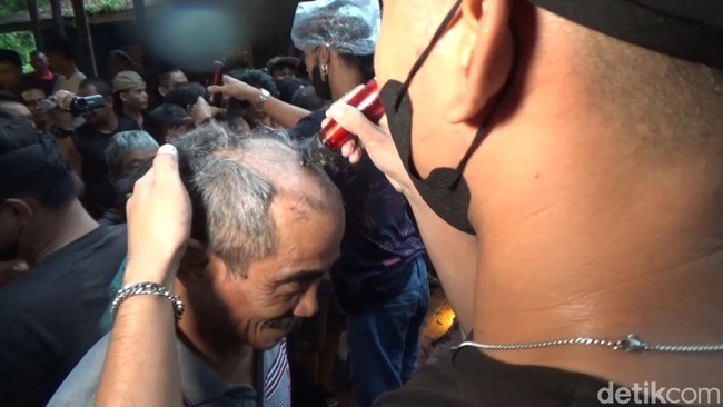 Hal serupa diungkapkan Jajang. Ia juga dicukur meski baru bagian depannya saja. "Ini belum selesai (dicukurnya), karena banyak yang antre, ini sebagai tanda jadi dicukur gundul," ucap Jajang.