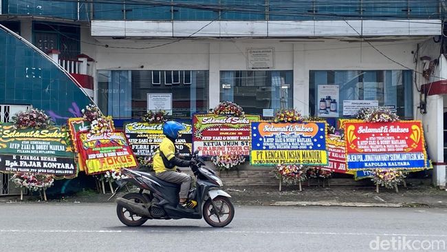 Karangan bunga memenuhi halaman Sekretariat Bersama (Sekber) pasangan calon Wali Kota dan Wakil Wali Kota Sukabumi nomor urut 2, Ayep Zaki-Bobby Maulana di Jalan Otto Iskandardinata, Jumat (29/11/2024). Tak hanya di Sekber, karangan bunga ucapan kemenangan pun dikirim ke kediaman Ayep Zaki di Jalan Pelabuhan II, Kota Sukabumi.