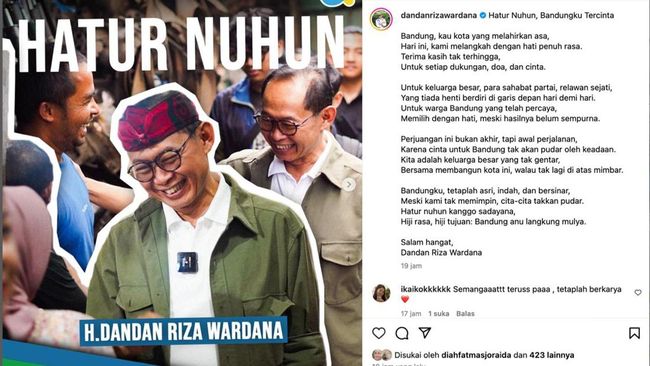 Informasi itu disampaikan melalui media sosial (medsos) resminya yakni Instagram @dandanrizawardana. Dandan juga memposting kolase foro yang berisikan dirinya saat berkampanye dan dekat dengan masyarakat Kota Bandung.